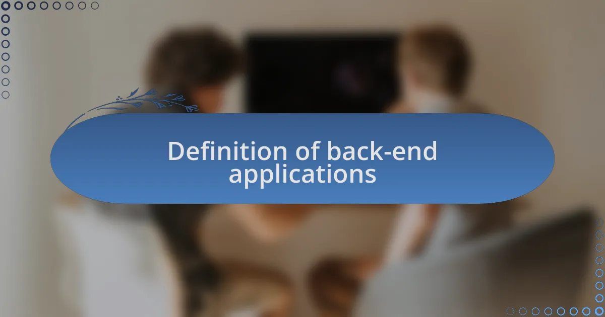 Back-end applications are the invisible engines that power the user experiences we often take for granted. They handle data processing, server-side logic, and database management, which means they are crucial in determining how a website interacts with users. I still remember the first time I realized just how much was happening behind the scenes when I clicked a button on an app; the complex web of processes fascinated me.